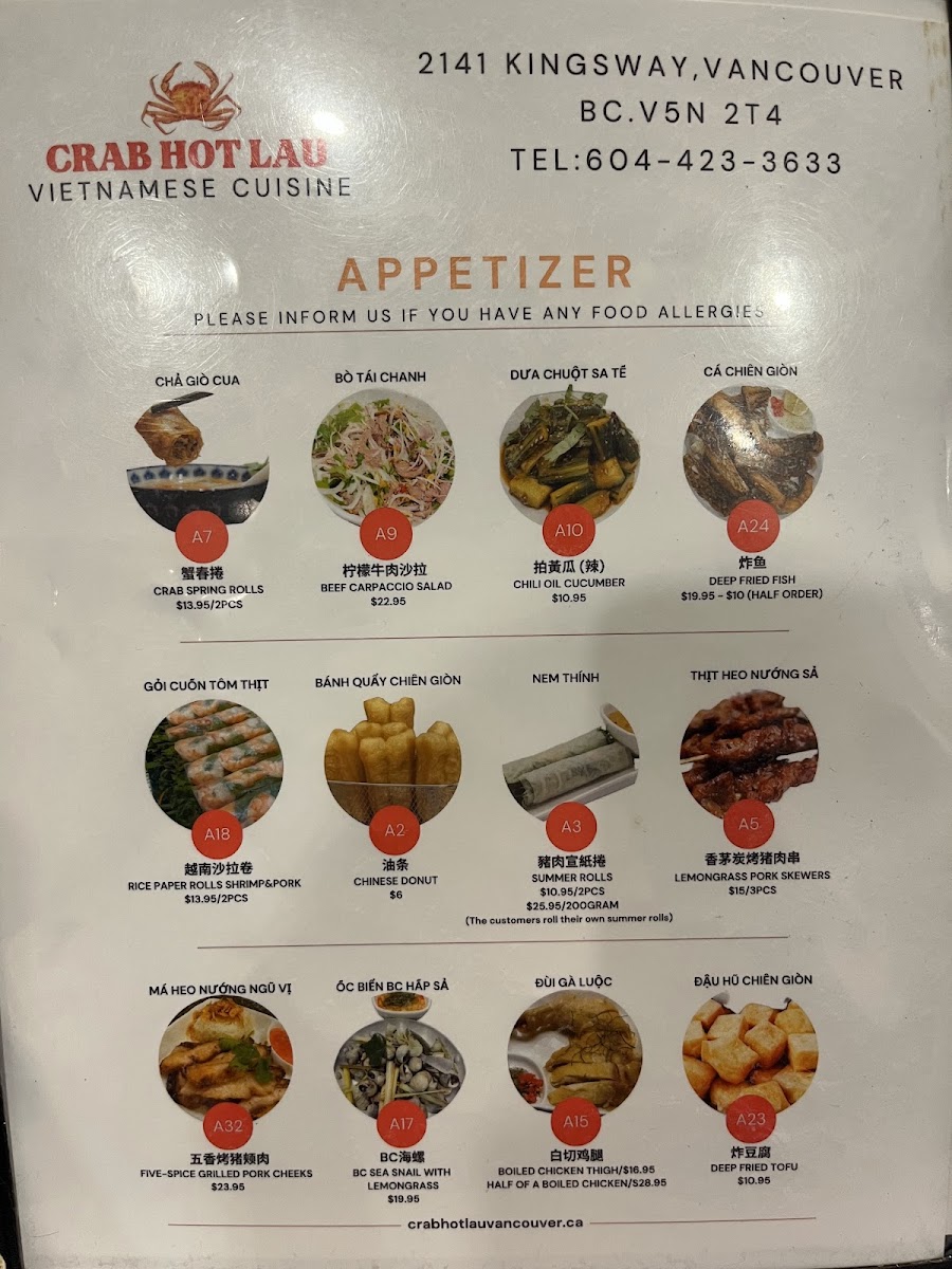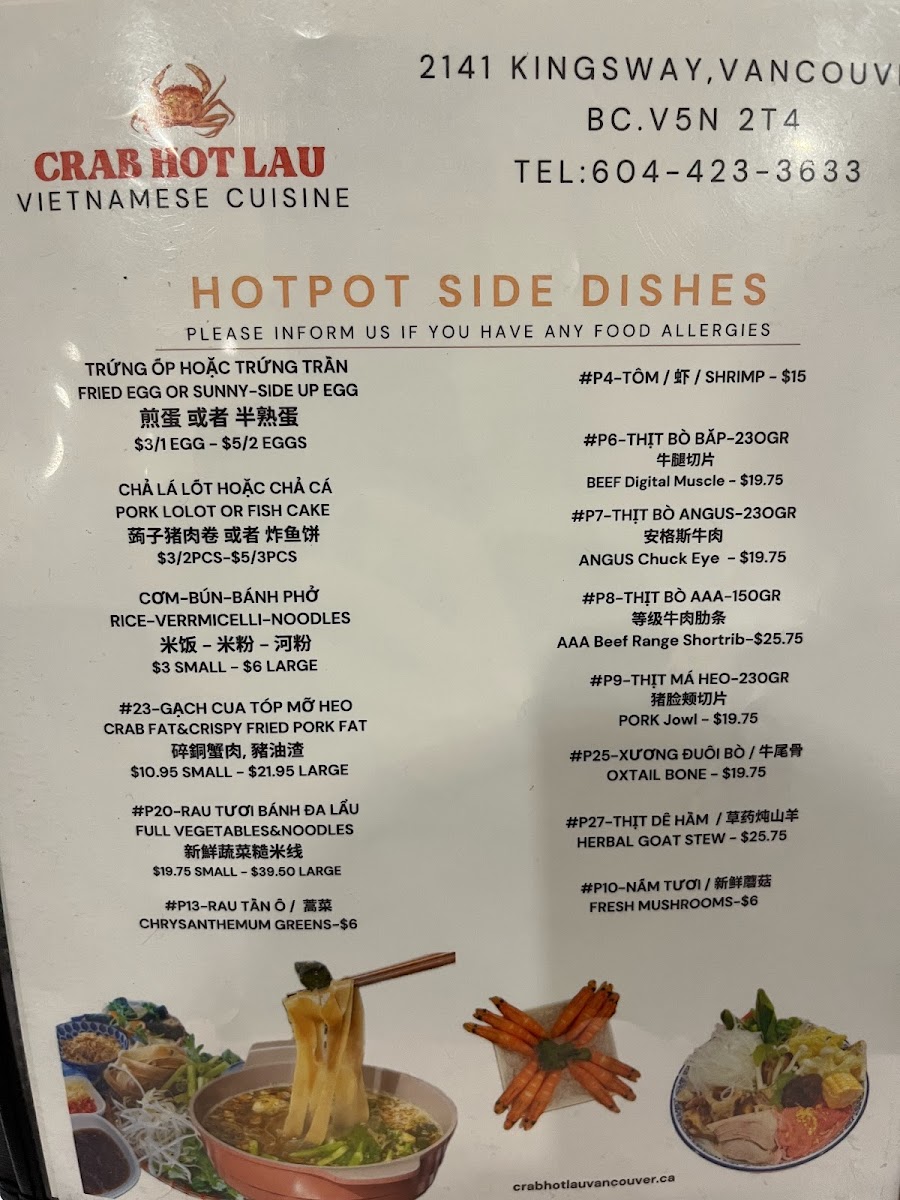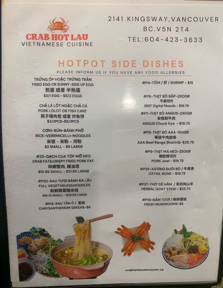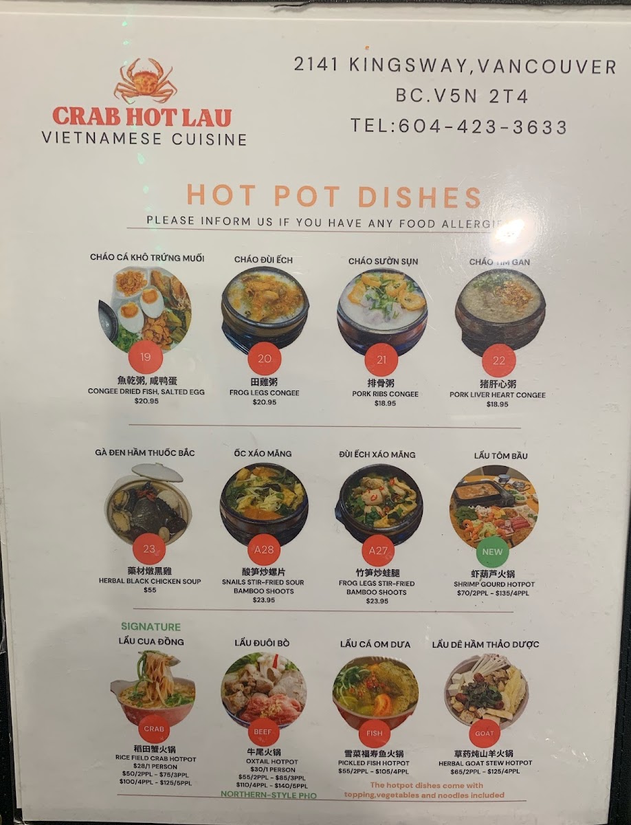 The menu at Crab Hot Lau features a variety of Northern Vietnamese and seafood dishes, with a particular focus on specialty hot pots and pho. It is organized into several key sections to facilitate easy selection.