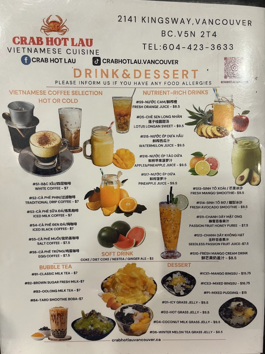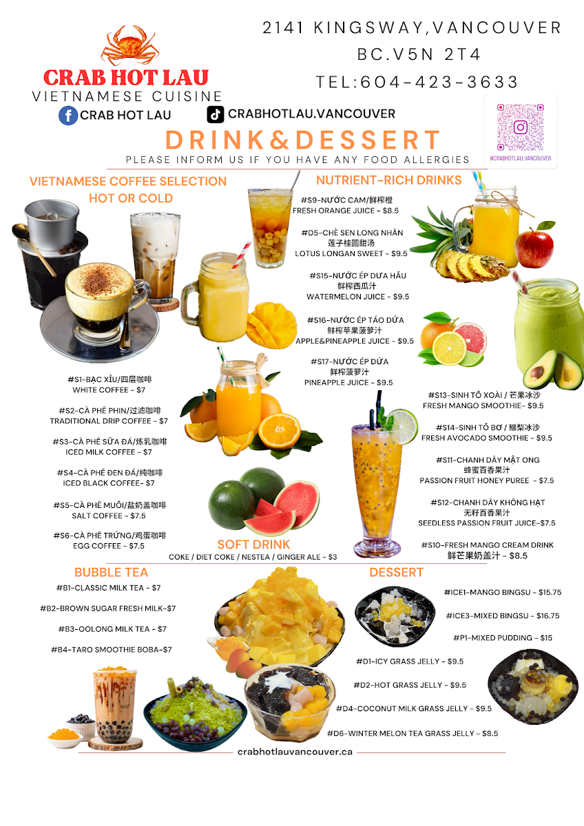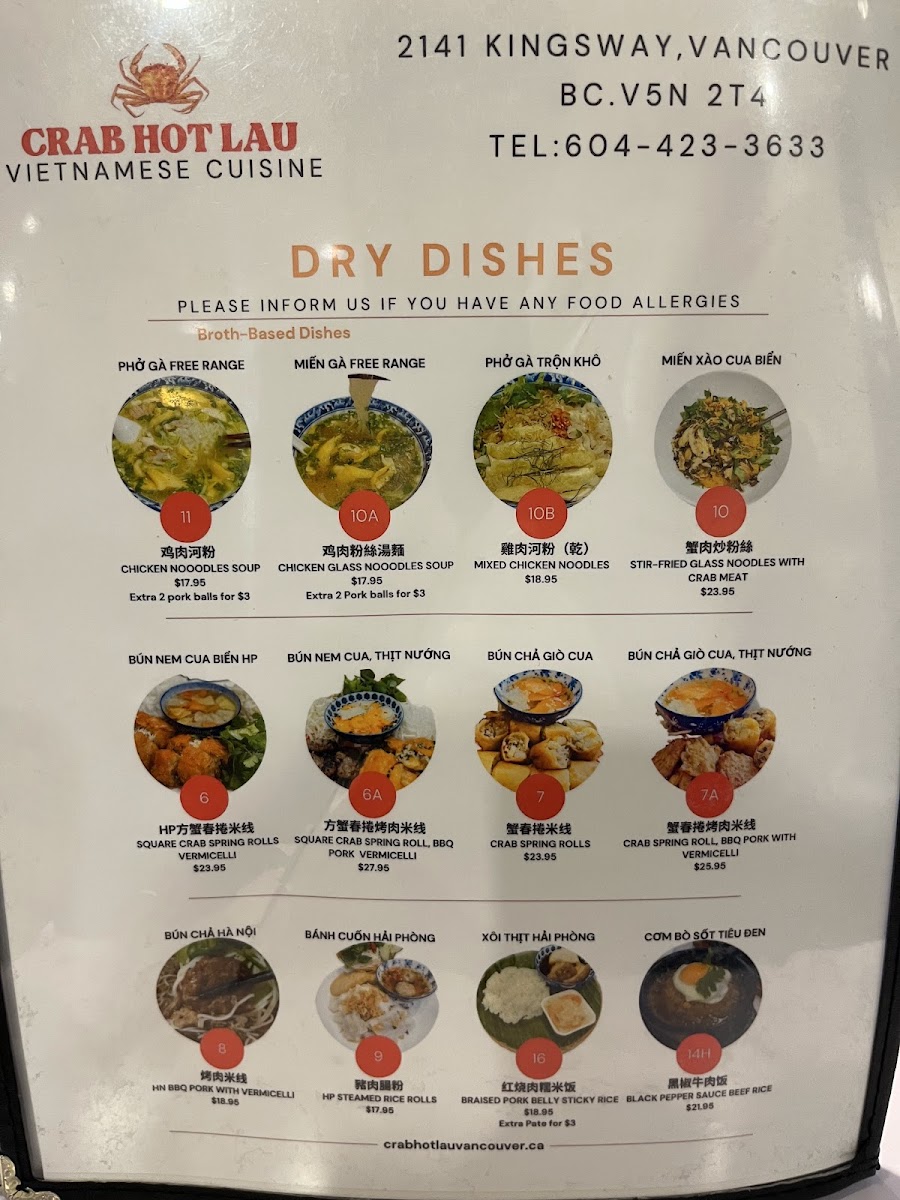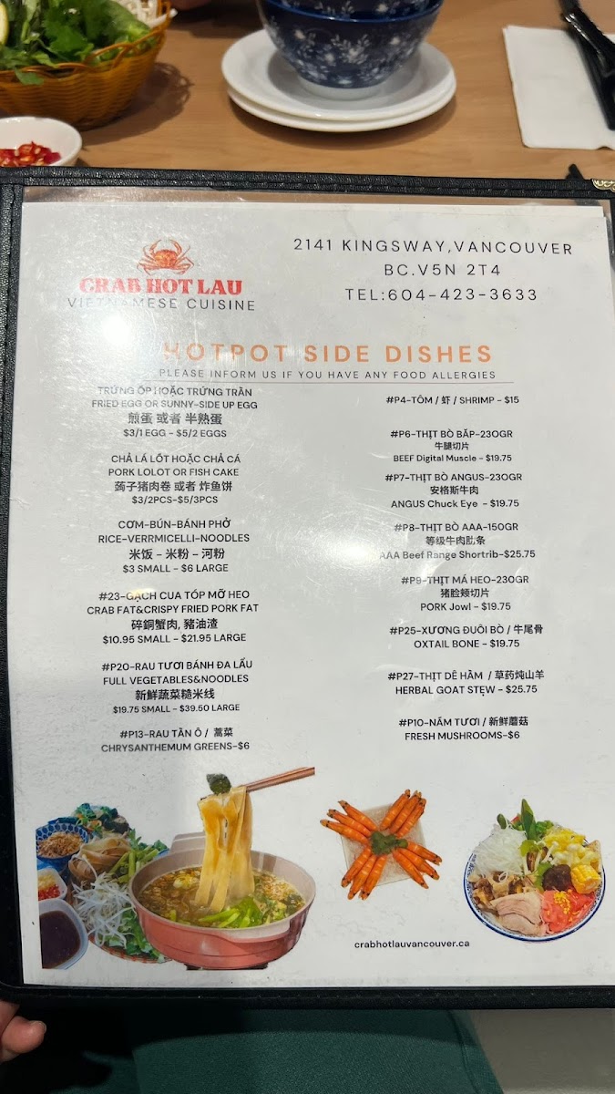 The menu at Crab Hot Lau features a variety of Northern Vietnamese and seafood dishes, with a particular focus on specialty hot pots and pho. It is organized into several key sections to facilitate easy selection.