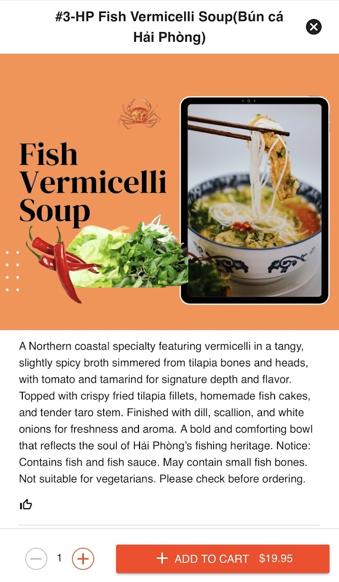 The menu is suitable for a range of dining occasions, from casual meals to quick takeout orders, offering both individual dishes and shareable hot pots. It combines seafood-focused entries with Northern Vietnamese culinary staples, catering to different preferences throughout the day.